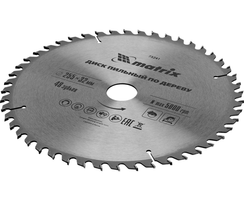 Пильный диск по дереву Matrix 73241 диаметром 255 х 32 мм, с 48 зубьями и переходным кольцом 32/30, — оснастка для циркулярных и торцовочных пил с соответствующим посадочным и внешним диаметром. Используется преимущественно для поперечного реза материалов из мягкой и твердой древесины, ДСП, ДВП, фанеры, столярных плит. В комплект поставки входит переходное кольцо 32/30, позволяющее самостоятельно изменить посадочный диаметр при необходимости. Диск подходит для бытового и профессионального применения. Преимущества Высокое качество выполняемых работ — мелкие зубья с попеременной заточкой обеспечивают точный и чистый рез. Прочность и высокий ресурс — основание изготовлено из стали 65Mn, режущие пластины выполнены из сплава YG8 твердостью более 88 HRA, зубья прошли алмазную заточку. Стабильная работа — компенсационные прорези снижают риск заклинивания диска.
