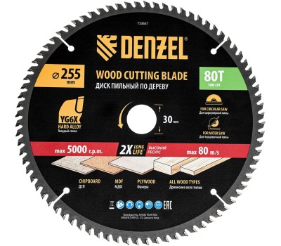 DENZEL Пильный диск по дереву ф255 х 30 мм, 80 зубьев 733637