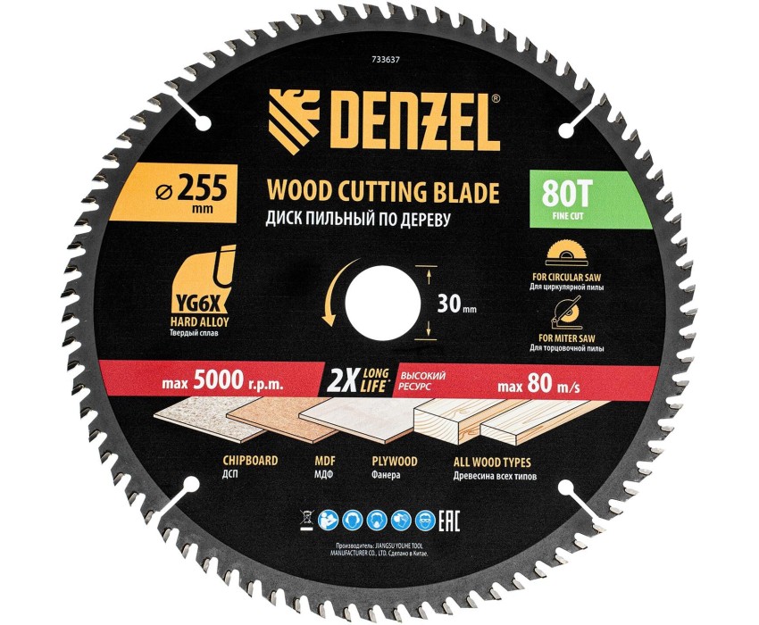 Пильный диск Denzel 733637 диаметром 255 x 30 мм, с 80 зубьями, предназначен для точного продольного и поперечного распила твердой и мягкой древесины, фанеры, МДФ, ДСП. 80 зубьев типа ATB с режущими пластинами оптимальной геометрии обеспечивают максимально чистый рез. Режущие пластины из твердого сплава YG6X сохраняют рабочие свойства при интенсивном использовании. Диск устанавливается на циркулярную, торцовочную пилу или на распиловочный станок. В комплект поставки входит переходное кольцо с 30 на 20 мм, что позволяет изменить посадочный размер и расширяет возможности использования диска. Преимущества Надежность — режущие пластины крепко зафиксированы методом пайки с использованием высококачественного термостойкого припоя, содержащего повышенное количество серебра. Долговечность — корпус изготовлен из пружинной стали 65Mn и прошел термическую обработку, поэтому выдерживает повышенные нагрузки. Высокое качество выполняемых работ — благодаря компенсационным прорезям диск не деформируется при нагрузках, обеспечивая стабильно ровный рез. Защита от разрушения — корпус покрыт лаком, переходное кольцо никелировано для предотвращения образования коррозии.