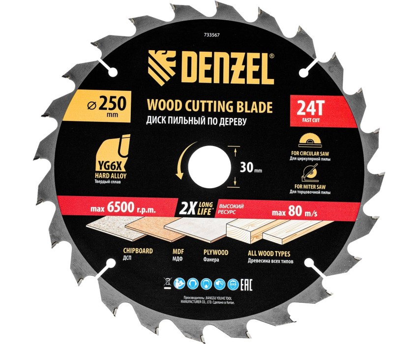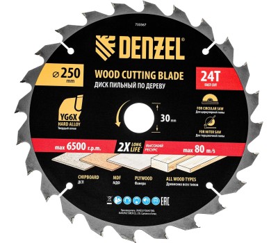 DENZEL Пильный диск по дереву ф250 х 30 мм, 24 зубьев 733567
