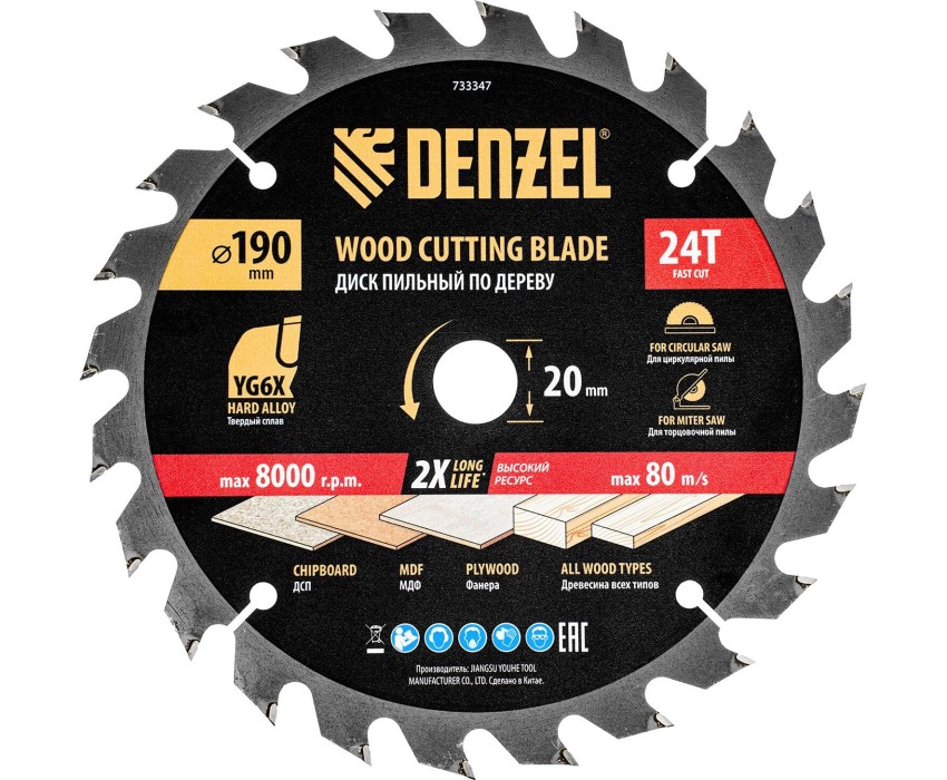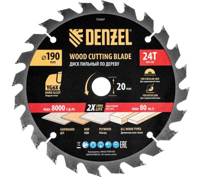 DENZEL Пильный диск по дереву ф190 х 20 мм, 24 зубьев 733347