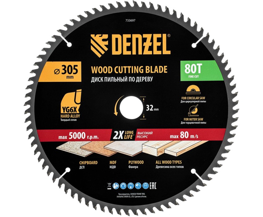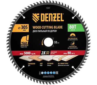 DENZEL Пильный диск по дереву ф305 х 32 мм, 80 зубьев 733697