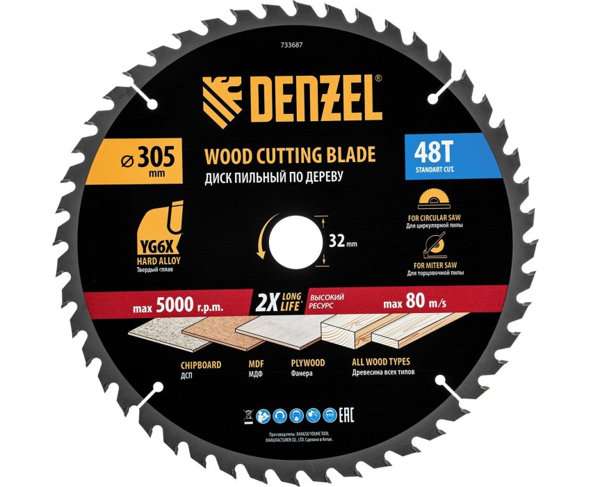 DENZEL Пильный диск по дереву ф305 х 32 мм, 48 зубьев 733687
