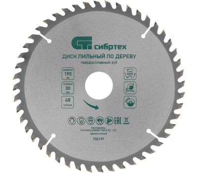СИБРТЕХ Пильный диск по дереву, 190 х 30 мм, 48 зубьев 732197