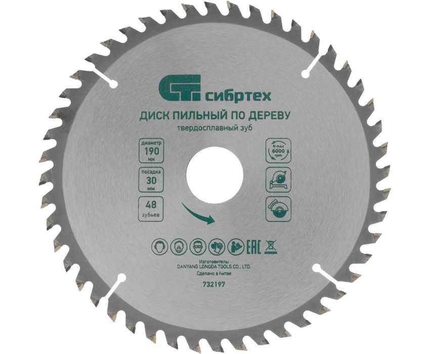 Пильный диск Сибртех 732197 диаметром 190 х 30 мм, с 48 зубьями, используется с торцовочными и циркулярными пилами, а также с распиловочными станками. Предназначен преимущественно для поперечного пиления древесины мягких и твердых пород, фанеры, МДФ и ДСП. Благодаря мелким зубьям достигается высокая точность реза. Диск применяется для выполнения строительных, ремонтных работ, а также для решения бытовых задач. Преимущества Высокий ресурс — режущие пластины из твердого сплава YG8 долго держат заточку. Надежность — основа диска изготовлена из устойчивой к нагрузкам стали 50, твердосплавные напайки крепко держатся на зубцах благодаря качественному медному припою. Стабильно качественный рез — диск пилит быстро и ровно за счет попеременной заточки зубьев, компенсационные пазы защищают диск от деформации в результате нагрева, предотвращая его заклинивание.