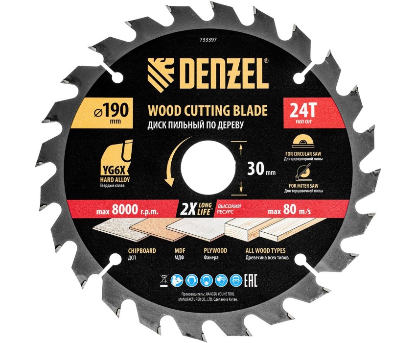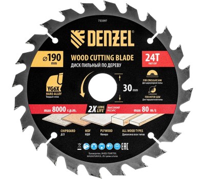 DENZEL Пильный диск по дереву ф190 х 30 мм, 24 зубьев 733397