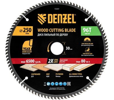 DENZEL Пильный диск по дереву ф250 х 30 мм, 96 зубьев 733597