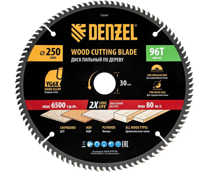 Пильный диск Denzel 733597 диаметром 250 x 30 мм, с 96 зубьями, предназначен для точного продольного и поперечного распила твердой и мягкой древесины, фанеры, МДФ, ДСП. 96 зубьев типа ATB с режущими пластинами оптимальной геометрии обеспечивают максимально чистый рез. Режущие пластины из твердого сплава YG6X сохраняют рабочие свойства при интенсивном использовании. Диск устанавливается на циркулярную, торцовочную пилу или на распиловочный станок. В комплект поставки входит переходное кольцо с 30 на 20 мм, что позволяет изменить посадочный размер и расширяет возможности использования диска. Преимущества Надежность — режущие пластины крепко зафиксированы методом пайки с использованием высококачественного термостойкого припоя, содержащего повышенное количество серебра. Долговечность — корпус изготовлен из пружинной стали 65Mn и прошел термическую обработку, поэтому выдерживает повышенные нагрузки. Высокое качество выполняемых работ — благодаря компенсационным прорезям диск не деформируется при нагрузках, обеспечивая стабильно ровный рез. Защита от разрушения — корпус покрыт лаком, переходное кольцо никелировано для предотвращения образования коррозии.