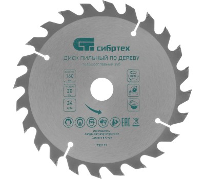 СИБРТЕХ Пильный диск по дереву, 160 х 20 мм, 24 зуба, кольцо 16/20 732117