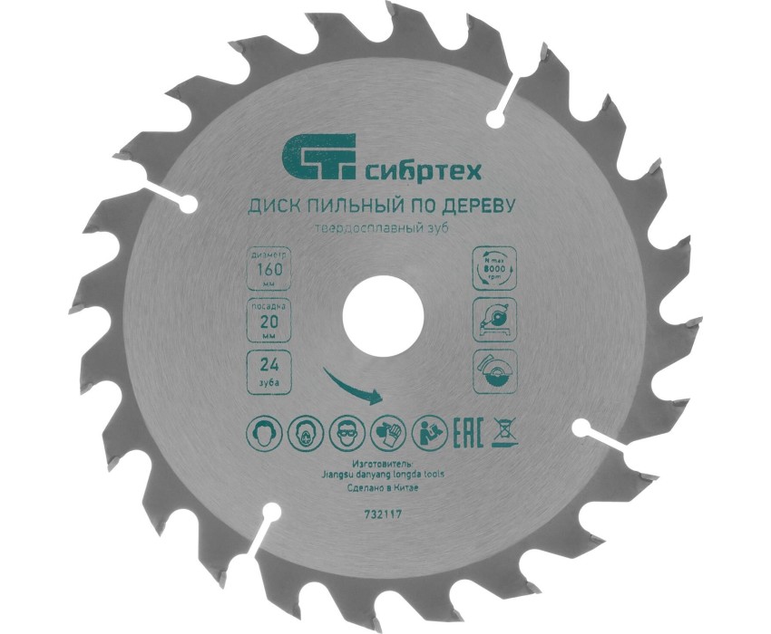 Пильный диск по дереву Сибртех 732117 диаметром 160 х 20 мм, с 24 зубьями и переходным кольцом 20/16, предназначен для быстрого распила древесины мягких и твердых пород, фанеры, ДСП, МДФ. Используется с циркулярными и торцовочными пилами с посадочным диаметром 20 мм. Переходное кольцо 20/16 позволяет при необходимости изменить размер посадки. Крупные зубья обеспечивают быстрый рез. Диск подходит для бытового применения. Преимущества Прочность и высокая производительность — основание диска изготовлено из стали 50, режущие пластины выполнены из твердого сплава YG8 и заточены с использованием алмазного абразива. Универсальность — зубья типа АТВ позволяют производить как продольный, так и поперечный рез. Качественный рез материалов — зубья имеют попеременную заточку. Защита от заклинивания — компенсационные прорези препятствуют деформации диска при нагреве. Высокий ресурс — режущие пластины припаяны качественным медным припоем, поэтому диск выдерживает интенсивные нагрузки.
