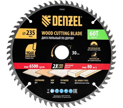 DENZEL Пильный диск по дереву ф235 х 30 мм, 60 зубьев 733557
