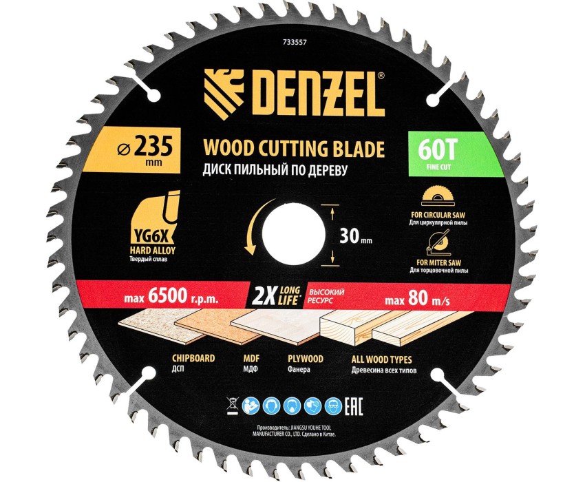 Пильный диск Denzel 733557 диаметром 235 x 30 мм, с 60 зубьями, предназначен для точного продольного и поперечного распила твердой и мягкой древесины, фанеры, МДФ, ДСП. 60 зубьев типа ATB с режущими пластинами оптимальной геометрии обеспечивают чистый рез. Режущие пластины из твердого сплава YG6X сохраняют рабочие свойства при интенсивном использовании. Диск устанавливается на циркулярную, торцовочную пилу или на распиловочный станок. В комплект поставки входит переходное кольцо с 30 на 20 мм, что позволяет изменить посадочный размер и расширяет возможности использования диска. Преимущества Надежность — режущие пластины крепко зафиксированы методом пайки с использованием высококачественного термостойкого припоя, содержащего повышенное количество серебра. Долговечность — корпус изготовлен из пружинной стали 65Mn и прошел термическую обработку, поэтому выдерживает повышенные нагрузки. Высокое качество выполняемых работ — благодаря компенсационным прорезям диск не деформируется при нагрузках, обеспечивая стабильно ровный рез. Защита от разрушения — корпус покрыт лаком, переходное кольцо никелировано для предотвращения образования коррозии.