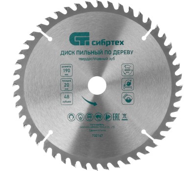 СИБРТЕХ Пильный диск по дереву, 190 х 20 мм, 48 зубьев, кольцо 16/20 732147