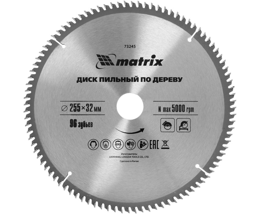 Пильный диск по дереву Matrix 73245 диаметром 255 х 32 мм, с 96 зубьями и переходным кольцом 32/30, — оснастка для циркулярных и торцовочных пил с соответствующим посадочным и внешним диаметром. Используется преимущественно для поперечного реза материалов из мягкой и твердой древесины, ДСП, ДВП, фанеры, столярных плит. В комплект поставки входит переходное кольцо 32/30, позволяющее самостоятельно изменить посадочный диаметр при необходимости. Диск подходит для бытового и профессионального применения. Преимущества Высокое качество выполняемых работ — мелкие зубья с попеременной заточкой обеспечивают точный и чистый рез. Прочность и высокий ресурс — основание изготовлено из стали 65Mn, режущие пластины выполнены из сплава YG8 твердостью более 88 HRA, зубья прошли алмазную заточку. Стабильная работа — компенсационные прорези снижают риск заклинивания диска.