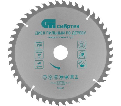 СИБРТЕХ Пильный диск по дереву, 250 х 32 мм, 48 зубьев 732667
