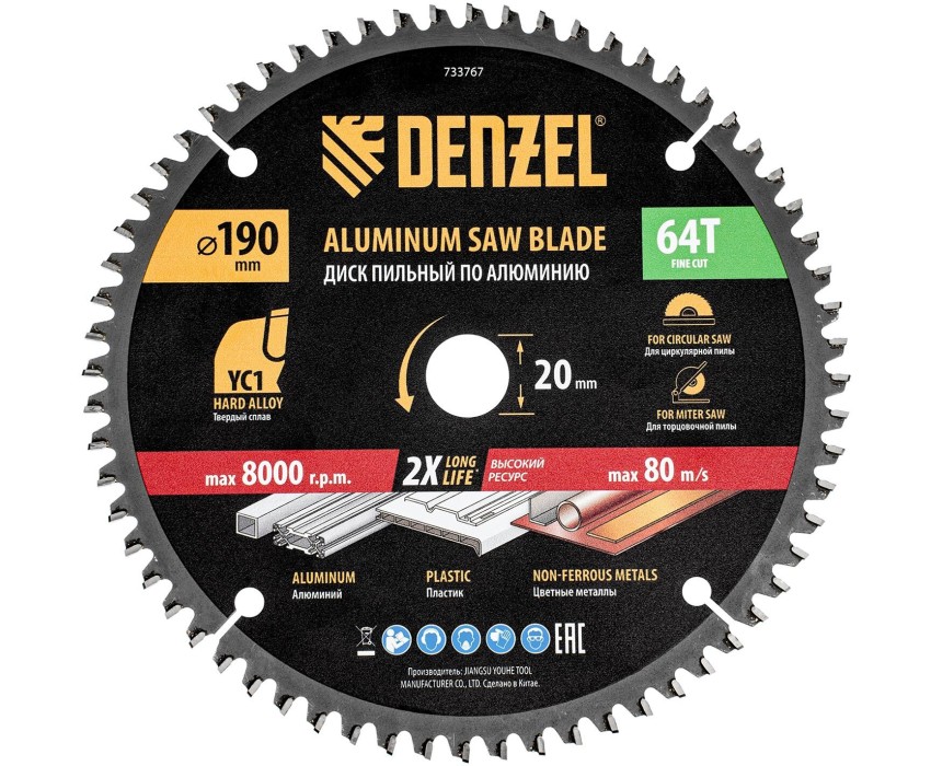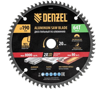 DENZEL Пильный диск по алюминию ф190 х 20 мм, 64 зубьев 733767