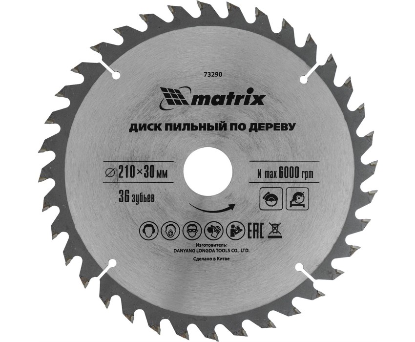 Пильный диск по дереву Matrix 73290 диаметром 210 х 30 мм, с 36 зубьями, — оснастка для циркулярных и торцовочных пил с соответствующим посадочным и внешним диаметром. Используется для продольного/поперечного реза материалов из мягкой и твердой древесины, ДСП, ДВП, фанеры, столярных плит. Диск подходит для бытового и профессионального применения. Преимущества Оптимальное соотношение скорости и качества реза — рабочая часть состоит из средних зубьев с попеременной заточкой. Прочность и высокий ресурс — основание изготовлено из стали 65Mn, режущие пластины выполнены из сплава YG8 твердостью более 88 HRA, зубья прошли алмазную заточку. Стабильная работа — компенсационные прорези снижают риск заклинивания диска.