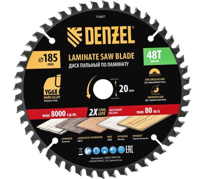 DENZEL Пильный диск по ламинату ф185 х 20 мм, 48 зубьев 733837