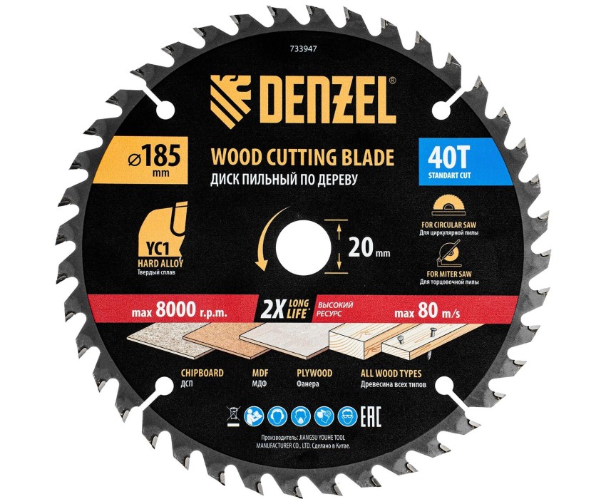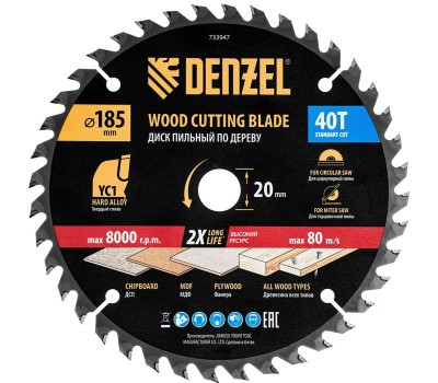 Пильный диск Denzel 733947 диаметром 185 x 20 мм, с 40 зубьями типа ATB, предназначен для продольного и поперечного распиливания древесины всех типов, в том числе с гвоздями и остатками бетона, а также ДСП, МДФ, фанеры. Тип реза — стандартный. Режущие пластины из твердого сплава YC1, прошедшие многоступенчатую заточку, позволяют успешно справляться с прочными материалами. Диск устанавливается на циркулярную, торцовочную пилу или на распиловочный станок. В комплект поставки входит переходное кольцо 20/16 мм, позволяющее изменить посадочный диаметр при необходимости. Преимущества Надежность — основа из пружинной стали 65Mn устойчива к повреждению. Высокие эксплуатационные свойства — твердосплавные пластины надежно закреплены при помощи высококачественного припоя, режущая часть выдерживает значительные нагрузки. Оптимальное соотношение скорости и качества пиления — рабочая часть с 40 зубьями обеспечивает быстрый и ровный рез. Продуманная конструкция — благодаря компенсационным прорезям снижаются вибрации, диск не деформируется во время работы, что повышает качество работы. Долговечность — лакированный корпус и никелированное переходное кольцо устойчивы к коррозии, что продлевает срок службы оснастки.