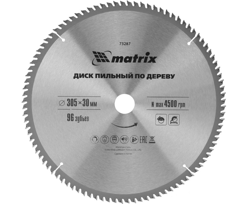Пильный диск по дереву Matrix 73287 диаметром 305 х 30 мм, с 96 зубьями, — оснастка для циркулярных и торцовочных пил с соответствующим посадочным и внешним диаметром. Используется преимущественно для поперечного реза материалов из мягкой и твердой древесины, ДСП, ДВП, фанеры, столярных плит. Диск подходит для бытового и профессионального применения. Преимущества Высокое качество выполняемых работ — мелкие зубья с попеременной заточкой обеспечивают точный и чистый рез. Прочность и высокий ресурс — основание изготовлено из стали 65Mn, режущие пластины выполнены из сплава YG8 твердостью более 88 HRA, зубья прошли алмазную заточку. Стабильная работа — компенсационные прорези снижают риск заклинивания диска.