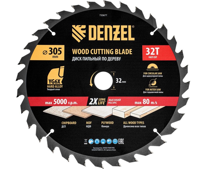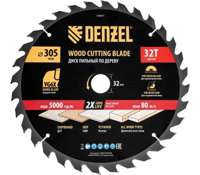 DENZEL Пильный диск по дереву ф305 х 32 мм, 32 зубьев 733677