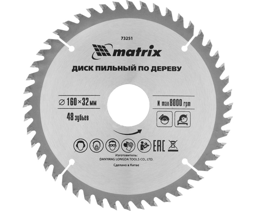 Пильный диск по дереву Matrix 73251 диаметром 160 х 32 мм, с 48 зубьями, — оснастка для циркулярных и торцовочных пил с соответствующим посадочным и внешним диаметром. Используется преимущественно для поперечного реза материалов из мягкой и твердой древесины, ДСП, ДВП, фанеры, столярных плит. Диск подходит для бытового и профессионального применения. Преимущества Прочность и высокий ресурс — основание изготовлено из стали 65Mn, режущие пластины выполнены из сплава ВК6 твердостью более 88 HRA, зубья прошли алмазную заточку. Стабильная работа — компенсационные прорези снижают риск заклинивания диска. Высокое качество выполняемых работ — мелкие зубья с попеременной заточкой обеспечивают точный и чистый рез. Надежность — твердосплавные пластины закреплены методом пайки с использованием улучшенного медного припоя.