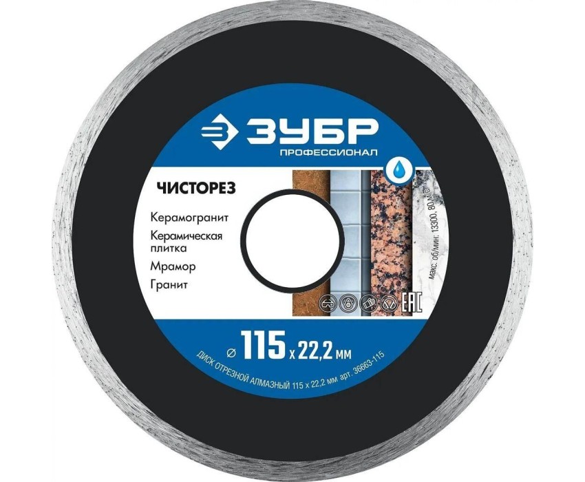 Тип: Отрезной диск Назначение: универсальный Бренд: ЗУБР Модель: 36663-115 PartNumber/Артикул Производителя: 36663-115 Описание: Резка твердой и мягкой керамической плитки, керамогранита, искусственного и натурального камня, мрамора при обязательном водяном охлаждении. Тип диска: алмазный Для инструмента: угловые шлифмашины Посадочный диаметр: 22.2 мм Толщина диска: 1.1 мм Диаметр диска (внешний): 115 мм Форма диска: прямая Макс. скорость вращения, не более: 13300 об/мин Тип реза: мокрый Страна производства: Китай Габариты упаковки (ед) ДхШхВ: 0.13x0.14x0.003 м Объем упаковки (ед): 0.0000546 м3 Вес упаковки (ед): 0.15 кг