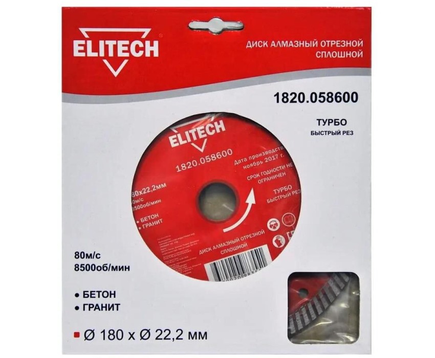 ELITECH Диск алмазный по бет./кирп./гран. 1820.058600 d=180мм d(посад.)=22.2мм (угловые шлифмашины) (упак.:1шт)