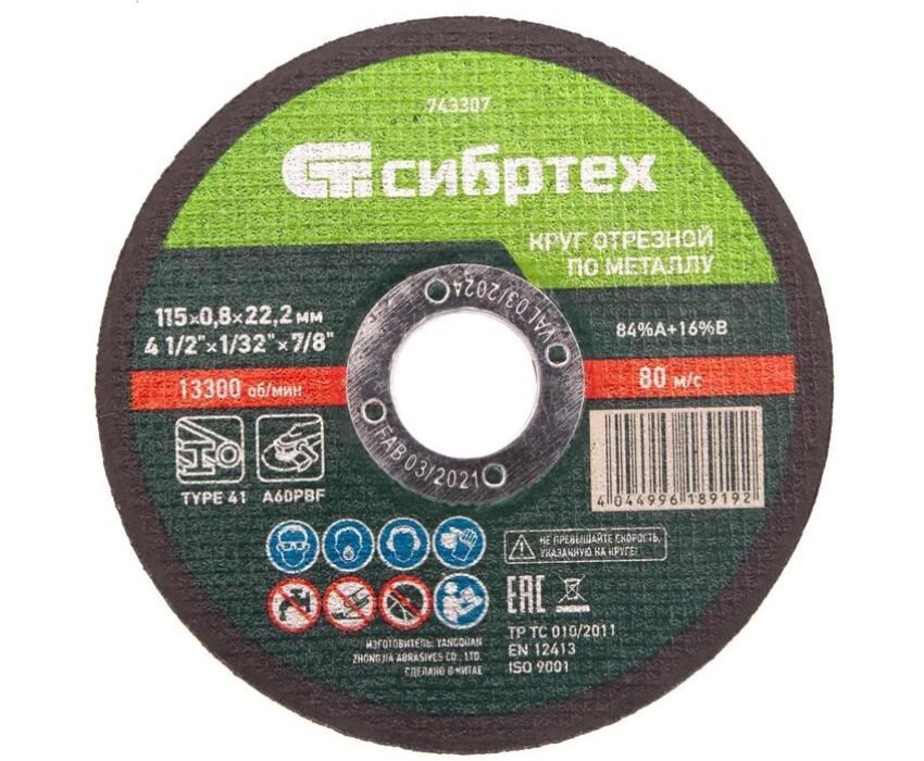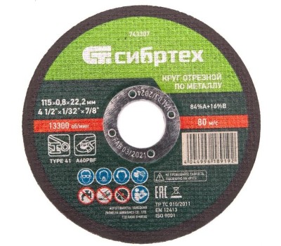 СИБРТЕХ Диск отрезной по мет. 743307 d=115мм d(посад.)=22.2мм (угловые шлифмашины) (упак.:1шт)