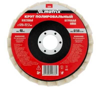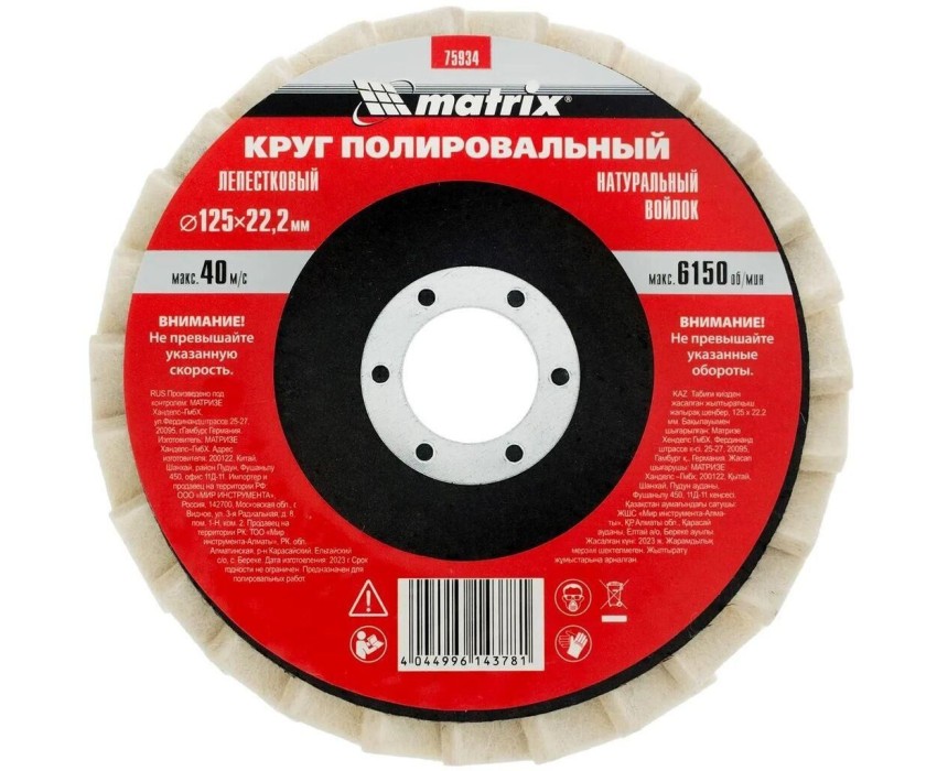 Назначение: по металлу Бренд: MATRIX Модель: 75934 PartNumber/Артикул Производителя: 75934 Тип: Лепестковый шлифкруг Описание: Круг лепестковый полировальный из натурального войлока. Используется для полирования плоских поверхностей из металла и других материалов с помощью УШМ. Для инструмента: угловые шлифмашины Диаметр диска (внешний): 125 мм Посадочный диаметр: 22.2 мм Толщина диска: 40 мм Тип диска: лепестковый Габариты упаковки (ед) ДхШхВ: 0.13x0.13x0.02 м Вес упаковки (ед): 0.438 кг Объем упаковки (ед): 0.000338 м3 Количество в упаковке: 1