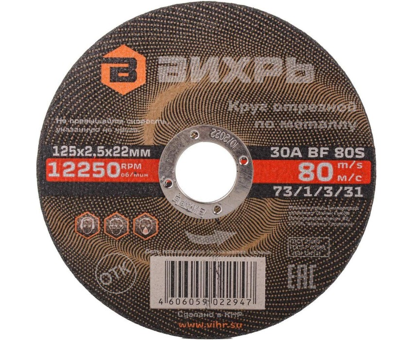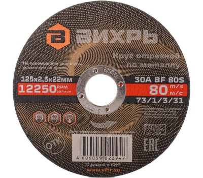 ВИХРЬ Диск отрезной по мет. 73/1/3/31 d=125мм d(посад.)=22.2мм (угловые шлифмашины) (упак.:25шт)