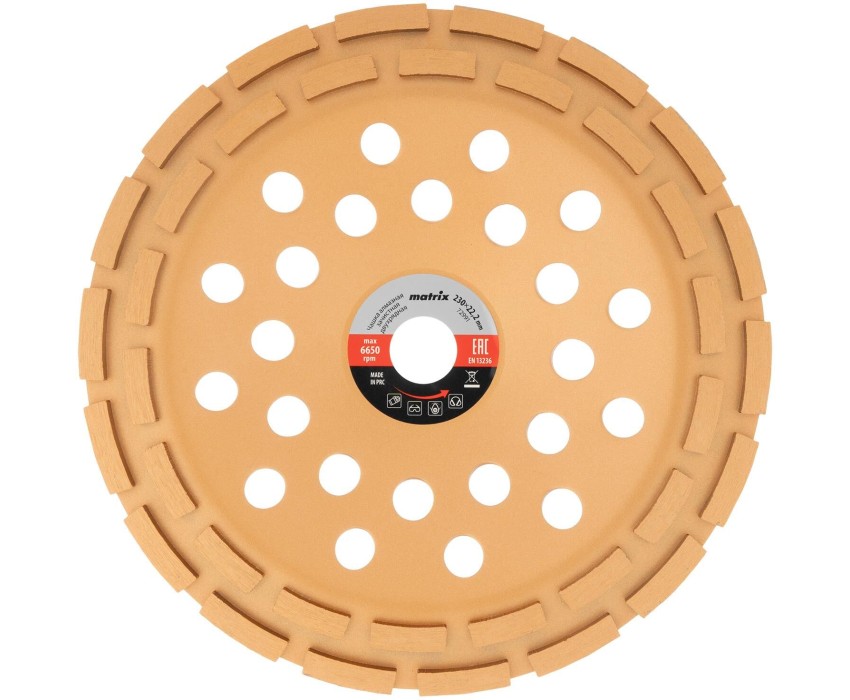 Двухрядная алмазная зачистная чашка Matrix 72991 диаметром 230 мм, с посадочным отверстием 22,2 мм, — оснастка для углошлифовальных машин, предназначенная для грубой обработки бетонных, каменных, кирпичных, мраморных и гранитных поверхностей. Позволяет проводить зачистку швов, стыков, неровностей, удаление наплывов. Придает поверхности шероховатость для улучшения ее адгезивной способности перед нанесением строительных растворов. Чашка предназначена для профессионального применения. Преимущества Высокий ресурс — рабочий слой толщиной 6 мм характеризуется увеличенной плотностью алмазов и сбалансированной связкой. Производительность — сегменты рабочей части расположены в 2 ряда, поэтому насадка снимает толстый слой материала. Эффективность и долгий срок службы — в корпусе предусмотрены отверстия для отвода шлама и тепла. Устойчивость к воздействию влаги — стальной корпус покрыт эмалью для защиты от коррозии. Гарантированное качество — чашка произведена на специализированном заводе с соблюдением всех технологический требований.