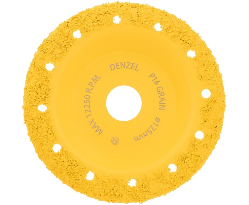 Твердосплавная зачистная чашка Denzel 72977 диаметром 125 мм, со средним зерном P16 и наклонной рабочей частью, устанавливается на углошлифовальную машину (УШМ) и используется для черновой обработки деревянных, пластиковых, резиновых, газобетонных и кирпичных поверхностей. Позволяет устранить неровности, снять слой старой краски, клея, цемента. В ходе зачистных работ не образуется абразивная пыль, что снижает вредное воздействие на здоровье пользователя. Наклонная рабочая часть упрощает обработку деталей сложной формы. Облегченный корпус позволяет избежать излишней нагрузки на УШМ и преждевременного выхода инструмента из строя. Преимущества Эффективность — абразив из твердого сплава карбида вольфрама ВК8 обеспечивает высокую режущую способность и скорость работы. Надежность — штампованный корпус из стали 45 отличается высокой прочностью. Высокий ресурс — абразивные зерна надежно закреплены на основании методом вакуумной пайки, рабочая поверхность не подвержена засаливанию. Производительность — в корпусе предусмотрены отверстия для отвода шлама, что обеспечивает высокую скорость работы и позволяет избежать перегрева оснастки. Защита от коррозии — на чашку нанесено эмалевое покрытие. Простой уход — после окончания работы достаточно очистить оснастку щеткой.