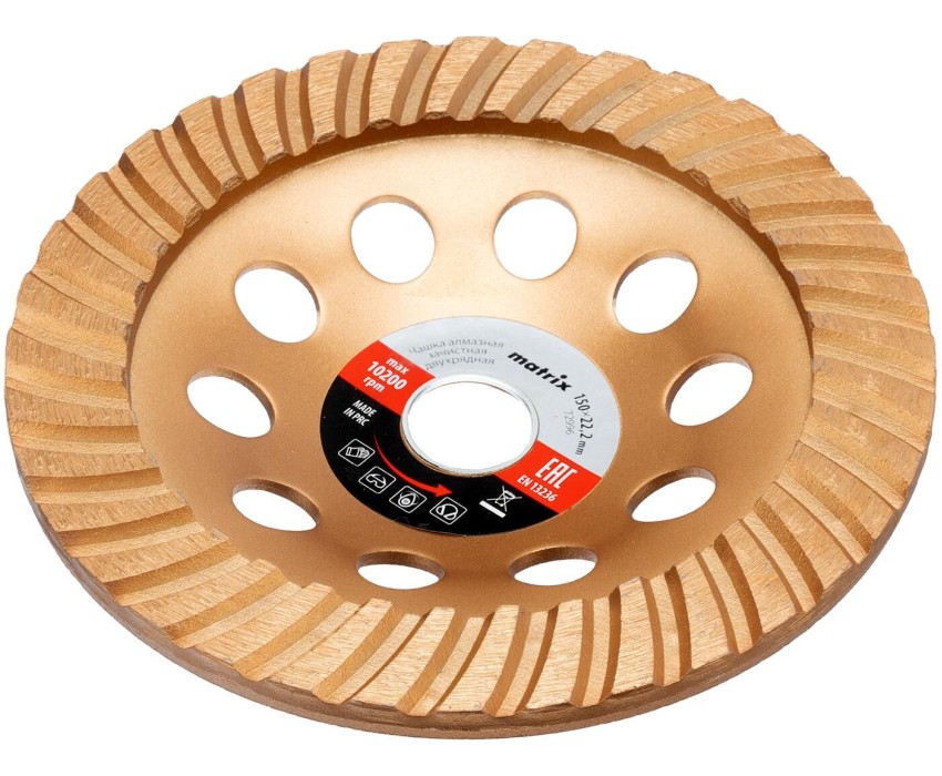 Алмазная зачистная чашка Matrix Turbo 72997 диаметром 150 мм устанавливается на вал углошлифовальной машины, для чего предусмотрено посадочное отверстие 22,2 мм. Используется для придания окончательной гладкости бетонным, каменным, мраморным, гранитным и кирпичным поверхностям, а также для снятия фаски на плитах из гранита или мрамора. Предназначена для профессионального применения. Преимущества Высокий ресурс — рабочий слой толщиной 5 мм характеризуется увеличенной плотностью алмазов и сбалансированной связкой. Работа без подачи воды — турбированная поверхность обеспечивает достаточное охлаждение. Быстрая и плавная шлифовка — чашка имеет увеличенную площадь соприкосновения с обрабатываемой поверхностью. Эффективность и долгий срок службы — в корпусе предусмотрены отверстия для отвода шлама и тепла. Устойчивость к воздействию влаги — стальной корпус покрыт эмалью для защиты от коррозии. Гарантированное качество — чашка произведена на специализированном заводе с соблюдением всех технологический требований.
