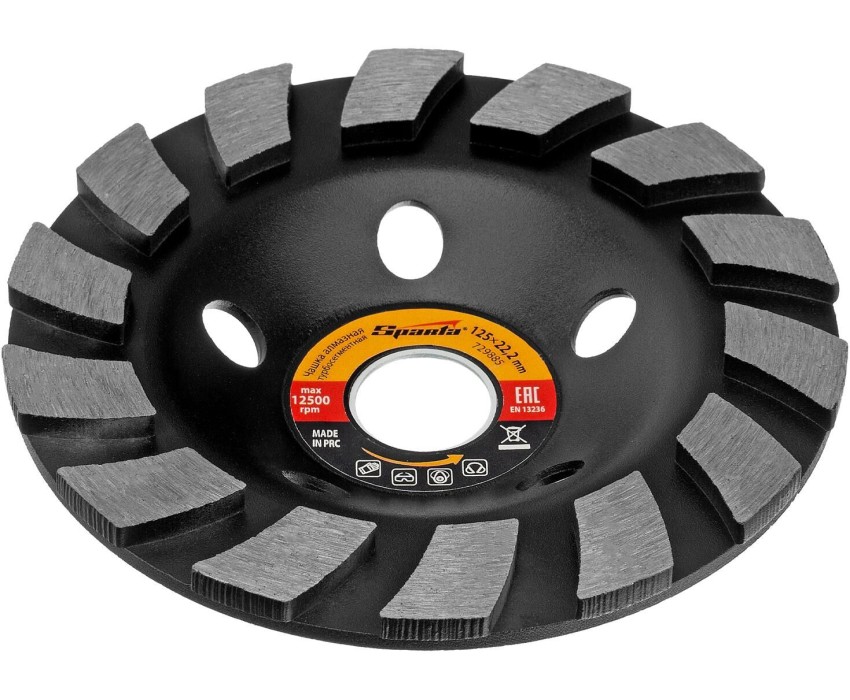 Алмазная зачистная чашка Sparta Турбо-сегмент 729885 диаметром 125 мм, с посадочным отверстием 22,2 мм, устанавливается на вал углошлифовальной машины и служит для шлифования бетонных, каменных, мраморных, гранитных и кирпичных поверхностей. С ее помощью можно проводить грубую обработку (понадобится несколько проходов) и чистовую шлифовку для придания материалу гладкости. Алмазный слой толщиной 4,5 мм обеспечивает ресурс работоспособности, достаточный для решения бытовых задач. Преимущества Работа без подачи воды — турбированная рабочая часть охлаждается в процессе шлифовки. Эффективный отвод шлама — в корпусе чаши предусмотрены специальные отверстия. Защита от разрушения — эмалированный стальной корпус не подвержен коррозии. Подтвержденное качество — зачистная чашка произведена на фирменном заводе и прошла контроль качества.