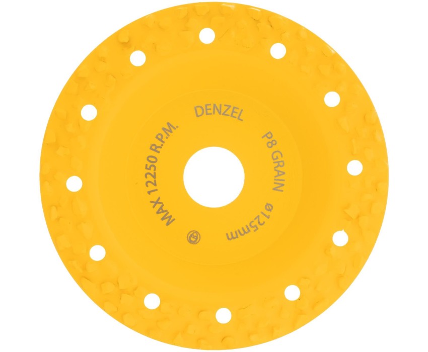 Твердосплавная зачистная чашка Denzel 72974 плоской формы, диаметром 125 мм, с крупным абразивным зерном P8, — оснастка для углошлифовальной машины, предназначенная для проведения обдирочных работ. Оптимальна для грубой обработки твердой и мягкой древесины, пластика, резины, газобетона, кирпича. Позволяет быстро и эффективно выровнять поверхность, удалить старое лакокрасочное покрытие, остатки клея, цемента и т.д. Не подходит для шлифования металла и твердого камня (гранита)! Благодаря облегченному корпусу чашки нагрузка на УШМ снижена, что продлевает срок службы инструмента. Преимущества Эффективность — режущие частицы из твердого сплава карбида вольфрама ВК8 характеризуется высокими рабочими свойствами и не образует абразивной пыли. Прочность — корпус изготовлен из стали 45 методом штамповки и устойчив к повреждениям. Высокий ресурс — абразивные зерна надежно закреплены на основании методом вакуумной пайки, рабочая поверхность не подвержена засаливанию. Производительность — в корпусе предусмотрены отверстия для отвода шлама, что обеспечивает высокую скорость работы и позволяет избежать перегрева оснастки. Защита от коррозии — на чашку нанесено эмалевое покрытие. Простой уход — после окончания работы достаточно очистить оснастку щеткой.