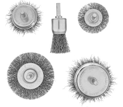 DENZEL Набор щеток для дрели, 2 Плоские 50-75мм, 3 Чашки 25-50-75мм, шпилька, нерж.вит. проволока 74493