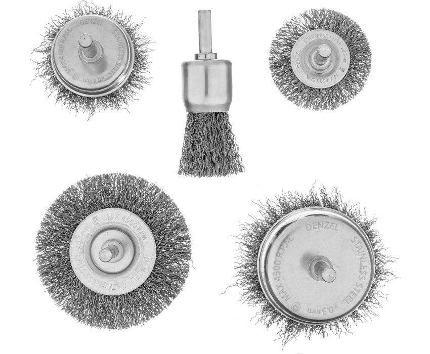 Набор щеток для дрели Denzel 74493 со шпилькой и щетиной из нержавеющей витой проволоки включает в себя 2 плоские насадки диаметром 50-75 мм и 3 «Чашки» диаметром 25-50-75 мм. Набор используется для щадящей обработки твердых поверхностей: металла, стали (в том числе нержавеющей), древесины, пластика, позволяет удалять старые лакокрасочные покрытия, ржавчину и загрязнения. Щетки в форме чашки оптимальны для обработки плоских поверхностей большой площади, плоская насадка удобна для зачистки пазов, изгибов и углов. Преимущества Высокое качество обработки — частицы щетины из нержавеющей стали AISI 201 не вызывают микрокоррозии очищаемых поверхностей. Устойчивость к коррозии — насадки можно использовать в условиях повышенной влажности. Надежность — каждая щетка имеет усиленный корпус, выдерживающий повышенные нагрузки. Долговечность — щетина из витой проволоки сохраняет форму даже при интенсивной эксплуатации. Быстрая подготовка к работе — щетки имеют хвостовик диаметром 6 мм для установки в патрон дрели. Удобная упаковка — набор поставляется в двойном блистере, позволяющем осмотреть его перед покупкой.