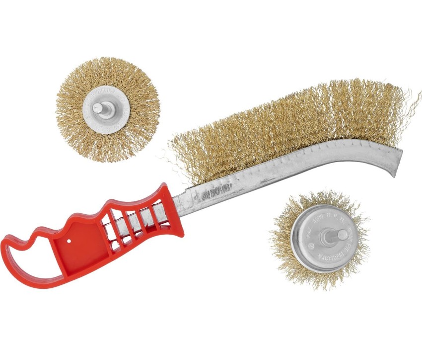 Набор Matrix 74484 состоит из 3 щеток: плоской диаметром 65 мм, «чашки» диаметром 50 мм со шпильками диаметром 6 мм для дрели, а также ручной металлической. Они эффективно удаляют тонкий слой ржавчины, краски, лака, а также убирают загрязнения. Насадкой в форме чашки удобно обрабатывать ровные поверхности, а плоской — работать в пазах и углах. Рекомендовано использование инструмента со скоростью вращения шпинделя до 4500 об/мин. Ручная щетка пригодится для обработки небольших площадей, когда применение электроинструментов нецелесообразно. Преимущества Прочность и высокий ресурс — щетина изготовлена из высококачественной стальной проволоки. Универсальность — набор подходит для обработки древесины, металла, пластика и других твердых материалов. Бережное очищение — витая щетина предназначена для щадящей обработки поверхностей. Защита от коррозии — корпусы щеток оцинкованы, а щетина латунирована. Комфортная работа — ручная щетка имеет эргономичную рукоятку с подпальцевыми выемками.