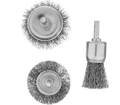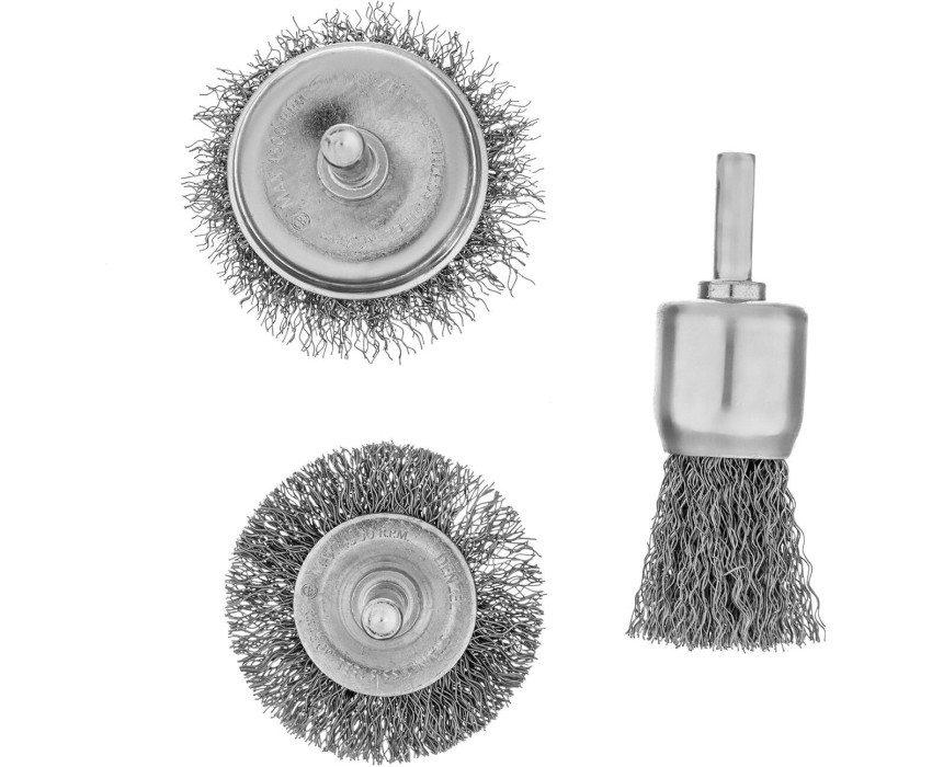 Набор щеток для дрели Denzel 74491 со шпилькой и щетиной из нержавеющей витой проволоки включает в себя 1 плоскую насадку диаметром 50 мм и 2 «Чашки» диаметром 25-50 мм. Набор используется для щадящей обработки твердых поверхностей: металла, стали (в том числе нержавеющей), древесины, пластика, позволяет удалять старые лакокрасочные покрытия, ржавчину и загрязнения. Щетки в форме чашки оптимальны для обработки плоских поверхностей большой площади, плоская насадка удобна для зачистки пазов, изгибов и углов. Преимущества Высокое качество обработки — частицы щетины из нержавеющей стали AISI 201 не вызывают микрокоррозии очищаемых поверхностей. Устойчивость к коррозии — насадки можно использовать в условиях повышенной влажности. Надежность — каждая щетка имеет усиленный корпус, выдерживающий повышенные нагрузки. Долговечность — щетина из витой проволоки сохраняет форму даже при интенсивной эксплуатации. Быстрая подготовка к работе — щетки имеют хвостовик диаметром 6 мм для установки в патрон дрели. Удобная упаковка — набор поставляется в двойном блистере, позволяющем осмотреть его перед покупкой.