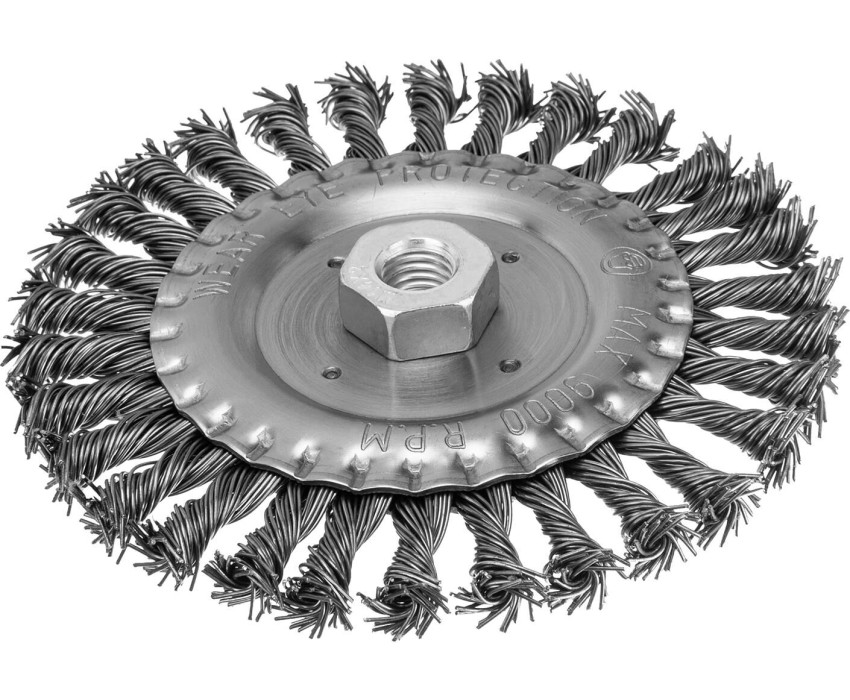 Плоская щетка Matrix 74645 диаметром 150 мм, с щетиной из крученой проволоки толщиной 0,8 мм и гайкой М14, — оснастка для УШМ, предназначенная для грубой (черновой) обработки поверхностей. Максимально допустимая скорость вращения шпинделя — 9000 об/мин. Щетка позволяет снять толстый слой ржавчины, лакокрасочных покрытий, загрязнений, а также зачистить сварные швы. Плоская форма удобна для обработки углов, изгибов и других труднодоступных мест. Преимущества Долговечность — щетина из высококачественной стальной проволоки устойчива к износу. Универсальность — щетка подходит для обработки любых твердых поверхностей: из металла, древесины, цветных металлов, пластика и т. д. Стойкость к разрушению — корпус оцинкован, а щетина покрыта техническим маслом для защиты от коррозии.