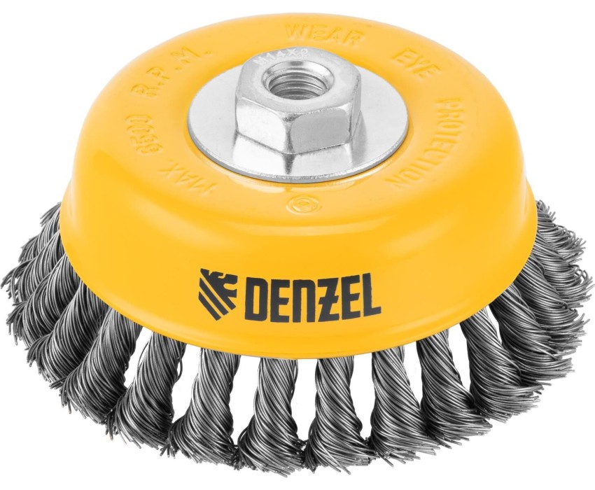 Щетка для УШМ «Чашка» Denzel 746273, М14, диаметром 125 мм, с щетиной из крученой нержавеющей проволоки диаметром 0,5 мм, предназначена для грубой очистки твердых поверхностей от ржавчины, лакокрасочных покрытий, загрязнений, удаления заусенцев, а также для зачистки сварных швов. Снимает толстый слой материала, идеально подходит для обработки изделий из нержавеющей стали. Щетка имеет форму чашки и позволяет очищать участки большой площади. Оснастку устанавливают на вал углошлифовальной машины. Рекомендуемая максимальная скорость вращения составляет 6500 об/мин. Во время работы следует использовать средства индивидуальной защиты — очки, респиратор, наушники, перчатки, а также специальную одежду и обувь. Щетка применяется в строительстве, на производстве, а также в быту. Преимущества Проволока толщиной 0,5 мм, скрученная в пучки, придает щетине устойчивость к повышенным нагрузкам. Покрытый эмалью корпус и щетина из нержавеющей стали AISI 201 не ржавеют, поэтому щетку можно использовать в условиях сильной влажности. Частицы проволоки из нержавейки, остающиеся на обрабатываемой поверхности, не вызывают ее коррозии. Усиленный корпус и гайка обеспечивают повышенную прочность щетки. Крепление на гайку М14 ускоряет установку и замену оснастки. Строгий контроль качества на всех этапах производства подтверждает надежность щетки.