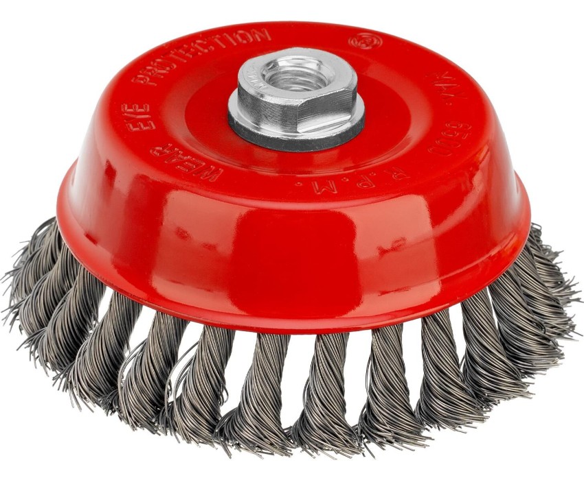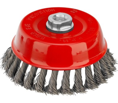 Щетка Matrix «Чашка» 74627 диаметром 125 мм, с присоединительной резьбой М14, с щетиной из крученой проволоки диаметром 0,5 мм, устанавливается на УШМ, поддерживающую работу со скоростью 6500 об/мин. Изделие предназначено для грубой (черновой) обработки поверхностей и подходит для удаления загрязнений, снятия толстого слоя ржавчины, ЛКМ, зачистки сварных швов. Преимущества Прочность и долговечность — щетина из крученой стальной проволоки выдерживает значительные нагрузки. Высокая производительность — насадка формы «чашка» оптимальна для зачистки больших поверхностей. Универсальность — щетка подходит для обработки любых твердых материалов: металла, древесины, цветных металлов, пластика и т. д. Устойчивость к разрушению — корпус покрыт эмалью, а щетина —техническим маслом.