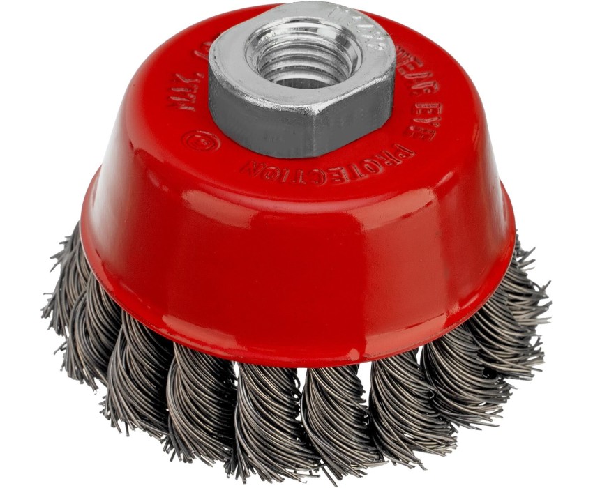 Щетка Matrix «Чашка» 74624 диаметром 75 мм, с присоединительной резьбой М14, с щетиной из крученой проволоки диаметром 0,5 мм, устанавливается на УШМ, поддерживающую работу со скоростью 12500 об/мин. Изделие предназначено для грубой (черновой) обработки поверхностей и подходит для удаления загрязнений, снятия толстого слоя ржавчины, ЛКМ, зачистки сварных швов. Преимущества Прочность и долговечность — щетина из крученой стальной проволоки выдерживает значительные нагрузки. Высокая производительность — насадка формы «чашка» оптимальна для зачистки больших поверхностей. Универсальность — щетка подходит для обработки любых твердых материалов: металла, древесины, цветных металлов, пластика и т. д. Устойчивость к разрушению — корпус покрыт эмалью, а щетина —техническим маслом.
