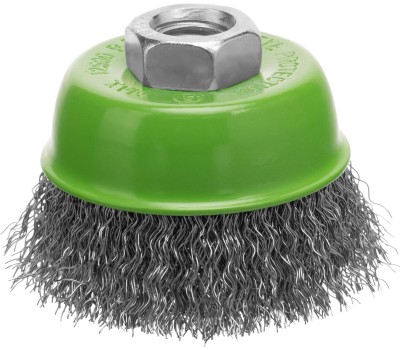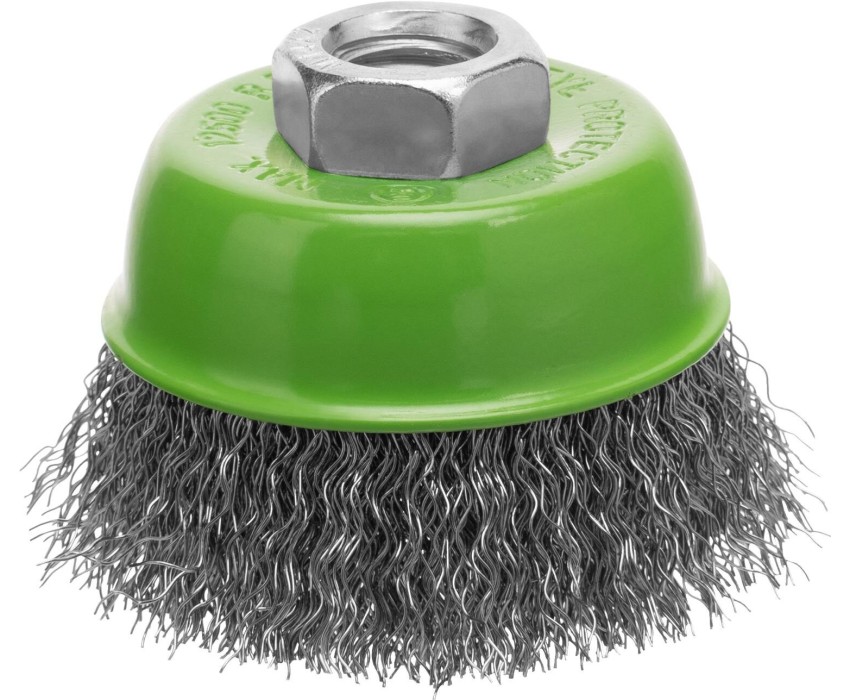 Щетка для УШМ Сибртех «чашка» 746037, М14, диаметром 65 мм, с щетиной из витой проволоки 0,3 мм, предназначена для постепенного снятия тонкого слоя материала с металлических, деревянных и пластиковых поверхностей. Удаляет ржавчину, загрязнения, а также остатки краски и других покрытий. Подходит для обработки участков значительной площади. Щетку устанавливают на вал углошлифовальной машины (УШМ), рекомендуемая максимальная скорость вращения 12500 об/мин. Работать с оснасткой следует в спецодежде. Преимущества Деформационная стойкость щетины — витая проволока принимает исходную форму после снятия нагрузок. Защита от коррозии — корпус покрыт эмалью, а на щетину нанесено техническое масло. Быстрая установка и замена насадки — щетка крепится на вал УШМ при помощи гайки М14.