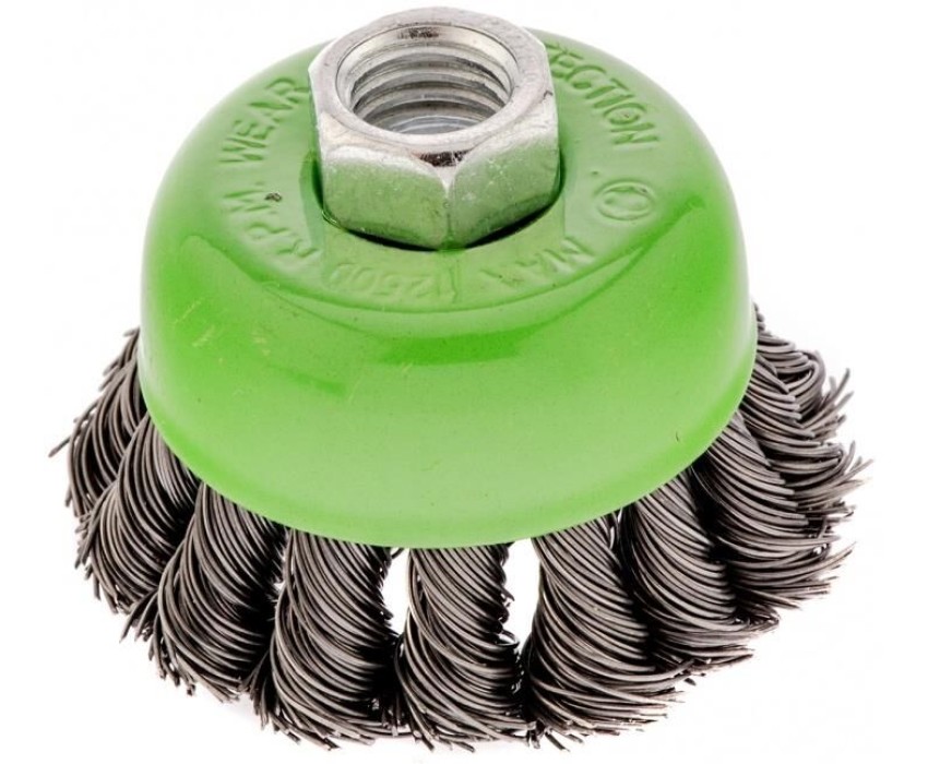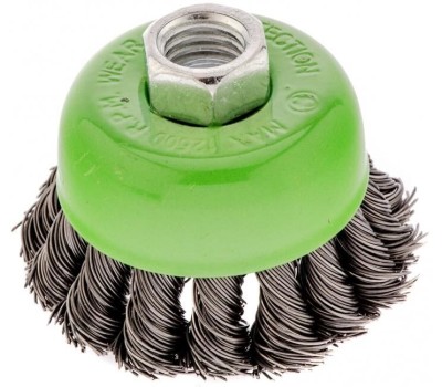Щетка Сибртех «Чашка» 746207 диаметром 65 мм, с присоединительной резьбой М14, с щетиной из крученой проволоки диаметром 0,5 мм, устанавливается на УШМ, поддерживающую работу со скоростью 12500 об/мин. Изделие предназначено для грубой (черновой) обработки поверхностей и подходит для удаления загрязнений, снятия толстого слоя ржавчины, ЛКМ, зачистки сварных швов. Преимущества Прочность и долговечность — щетина из крученой стальной проволоки выдерживает значительные нагрузки. Высокая производительность — насадка формы «чашка» оптимальна для зачистки больших поверхностей. Универсальность — щетка подходит для обработки любых твердых материалов: металла, древесины, цветных металлов, пластика и т. д. Устойчивость к разрушению — корпус покрыт эмалью, а щетина —техническим маслом.