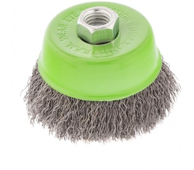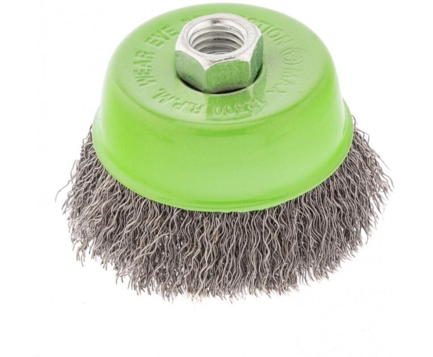 Щетка для УШМ Сибртех «чашка» 746047, М14, диаметром 75 мм, с щетиной из витой проволоки 0,3 мм, предназначена для постепенного снятия тонкого слоя материала с металлических, деревянных и пластиковых поверхностей. Удаляет ржавчину, загрязнения, а также остатки краски и других покрытий. Подходит для обработки участков значительной площади. Щетку устанавливают на вал углошлифовальной машины (УШМ), рекомендуемая максимальная скорость вращения 12500 об/мин. Работать с оснасткой следует в спецодежде. Преимущества Деформационная стойкость щетины — витая проволока принимает исходную форму после снятия нагрузок. Защита от коррозии — корпус покрыт эмалью, а на щетину нанесено техническое масло. Быстрая установка и замена насадки — щетка крепится на вал УШМ при помощи гайки М14.