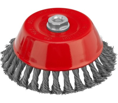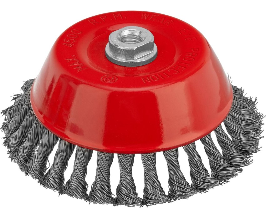 Щетка Matrix «Чашка» 74629 диаметром 150 мм, с присоединительной резьбой М14, с щетиной из крученой проволоки диаметром 0,5 мм, устанавливается на УШМ, поддерживающую работу со скоростью 4500 об/мин. Изделие предназначено для грубой (черновой) обработки поверхностей и подходит для удаления загрязнений, снятия толстого слоя ржавчины, ЛКМ, зачистки сварных швов. Преимущества Прочность и долговечность — щетина из крученой стальной проволоки выдерживает значительные нагрузки. Высокая производительность — насадка формы «чашка» оптимальна для зачистки больших поверхностей. Универсальность — щетка подходит для обработки любых твердых материалов: металла, древесины, цветных металлов, пластика и т. д. Устойчивость к разрушению — корпус покрыт эмалью, а щетина —техническим маслом.
