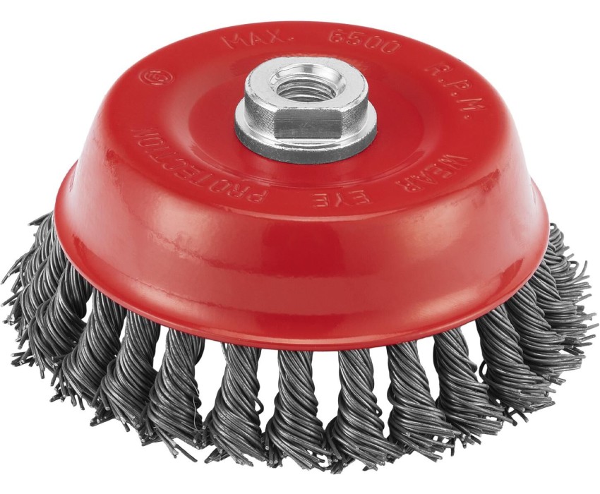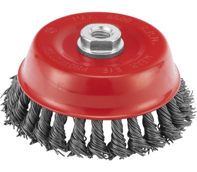 Щетка Matrix «Чашка» 74625 диаметром 125 мм, с присоединительной резьбой М14, с щетиной из крученой проволоки диаметром 0,8 мм, устанавливается на УШМ, поддерживающую работу со скоростью 6500 об/мин. Щетина предназначена для грубой (черновой) обработки поверхностей, более агрессивной по сравнению с щетиной 0,5 мм. Изделие подходит для удаления загрязнений, снятия толстого слоя ржавчины, ЛКМ, зачистки сварных швов. Преимущества Прочность и долговечность — щетина из крученой стальной проволоки выдерживает значительные нагрузки. Высокая производительность — насадка формы «чашка» оптимальна для зачистки больших поверхностей. Универсальность — щетка подходит для обработки любых твердых материалов: металла, древесины, цветных металлов, пластика и т. д. Устойчивость к разрушению — корпус покрыт эмалью, а щетина —техническим маслом.