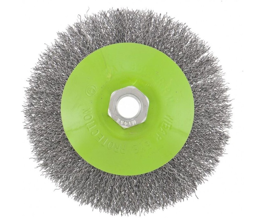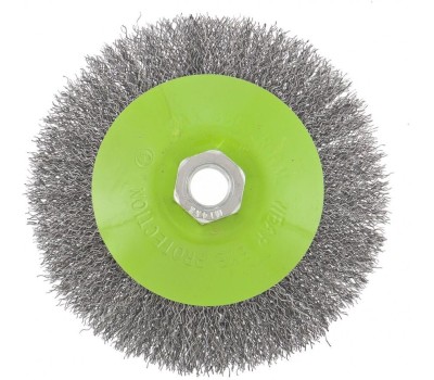 Щетка для УШМ «Тарелка» Сибртех 746167, М14, 125 мм, с щетиной из витой проволоки толщиной 0,3 мм, применяется для очистки металлических, деревянных и пластиковых поверхностей от ржавчины, старых лакокрасочных покрытий и загрязнений. Очищает как плоскости, так и труднодоступные места, поэтому оптимальна для обработки изделий сложной формы. Подходит для придания материалу шероховатости и матовости. Щетка устанавливается на вал углошлифовальной машины и выдерживает вращение со скоростью до 12500 об/мин, что обеспечивает высокую производительность оснастки. Во время работы следует использовать средства индивидуальной защиты. Щетка пригодится для проведения ремонта и решения бытовых задач. Преимущества Деформационная стойкость щетины — витая проволока принимает исходную форму после снятия нагрузок. Защита от коррозии — корпус покрыт эмалью, а на щетину нанесено техническое масло. Быстрая установка и замена насадки — щетка крепится на вал УШМ при помощи гайки М14.
